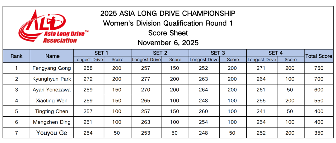 2025亚洲长打锦标赛第一天比赛顺利结束,比赛成绩如下: